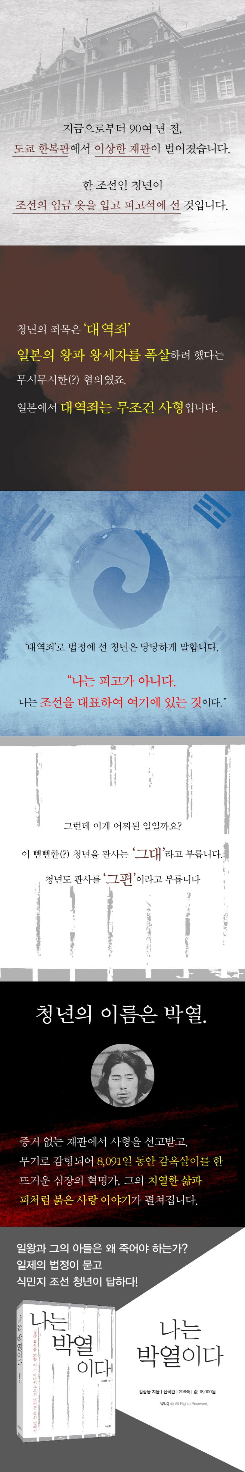 『나는 박열이다』는 일본 역사상 전무후무한, 가장 기이했던 재판 풍경을 ‘주문 세팅’한 패기만만한 독립운동가 박열의 일대기를 기록한 책이다. 연인이자 동지인 가네코 후미코와 함께 일왕 부자를 폭살시키려 했다는 죄목으로 재판정에 서고, 증거 없는 재판에서 사형을 선고받은 남자, 무기징역으로 감형되어 8,091일 동안 감옥살이를 한 뜨거운 심장의 혁명가, 그의 치열했던 삶과 피처럼 붉은 사랑 이야기를 당시 신문보도와 심문조서 등 자료를 토대로 담담하고 차분하게 복원해냈다.