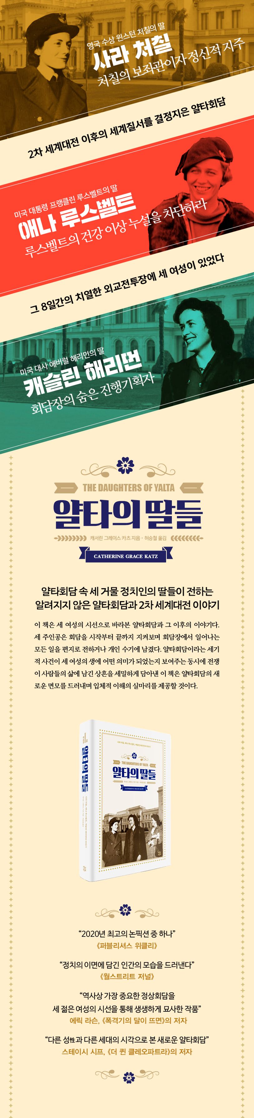 20세기 가장 중요한 회담으로 여겨지는 얄타회담에는 ‘3거두’ 처칠, 루스벨트, 스탈린을 비롯해 수백 명의 외교·군사 자문단이 참석했다. 그리고 세 여인, 미국 대통령 프랭클린 루스벨트의 딸 애나 루스벨트, 영국 수상 윈스턴 처칠의 딸 사라 처칠, 소련 주재 미국 대사 애버럴 해리먼의 딸 캐슬린 해리먼도 이 회담에 참석했다. 이 책은 세 여인의 시선으로 바라본 얄타회담과 그 이후의 이야기이다. 세 주인공은 회담을 시작부터 끝까지 지켜보며 회담장에서 일어나는 모든 일을 기록해 가족이나 친구에게 편지로 전하거나 개인 수기에 남겼다. 얄타회담이라는 세기적 사건이 세 여인의 생에 어떤 의미가 되었는지 보여주는 동시에 전쟁이 사람들의 삶에 남긴 상흔을 세밀하게 담아낸 이 책은 얄타회담의 새로운 면모를 드러내며 입체적 이해의 실마리를 제공할 것이다.