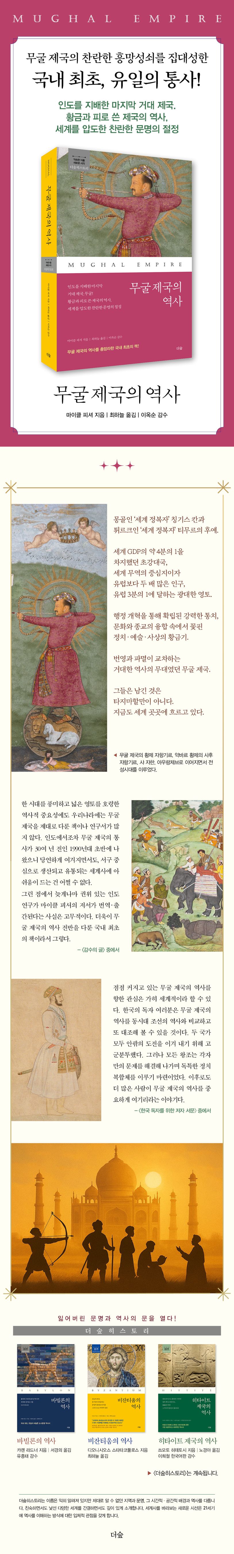 이 책은 무굴의 시작부터 멸망까지를 다룬 국내 최초로 소개되는 통사다. 무굴 제국은 단순한 왕조가 아니다. 힌두교와 이슬람, 수많은 언어와 민족이 뒤섞인 광대한 대륙을 융합과 포용, 공존의 방식으로 통합하고 통치했던 거대한 정치 실험장이었다. 또한 세계 GDP의 약 4분의 1을 차지했던 초강대국, 세계 무역의 중심지이자 유럽보다 두 배 많은 인구, 유럽 3분의 1에 달하는 광대한 영토, 개혁과 혁신을 통해 확립한 강력한 행정 제도, 문화와 종교의 융합 속에서 꽃핀 정치·예술·사상의 황금기, 이 모든 것이 무굴 제국이었다. 무굴 제국은 인도가 ‘가난한 나라’가 아니라 유럽 열강이 동경했던 ‘황금의 땅’이었음을 보여 준다.
