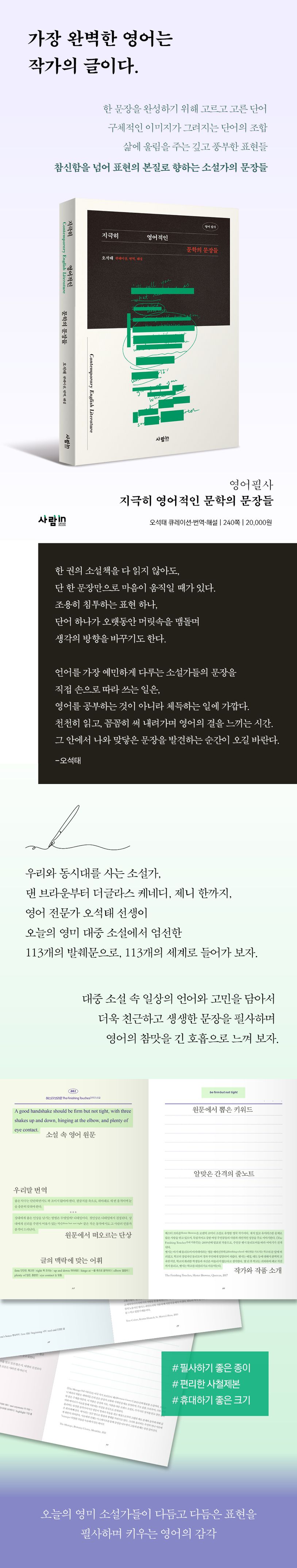 언어를 가장 예민하게 다루는 소설가들의 문장을 직접 손으로 따라 쓰는 일은, 영어를 공부한다기보다 체득하는 일에 가깝습니다. 동시대의 영미 소설 속에 담긴 문장들을 천천히 읽고, 꼼꼼히 써 내려가며 영어의 결과 영어의 참맛을 느끼는 시간. 그 안에서 나와 맞닿은 문장과 표현을 발견하는 순간이 옵니다. 113개 작품 속 문장들을 차곡차곡 필사하다 보면, 작가의 문장이 나의 것이 되고 영어의 감각은 자연스럽게 쌓입니다.