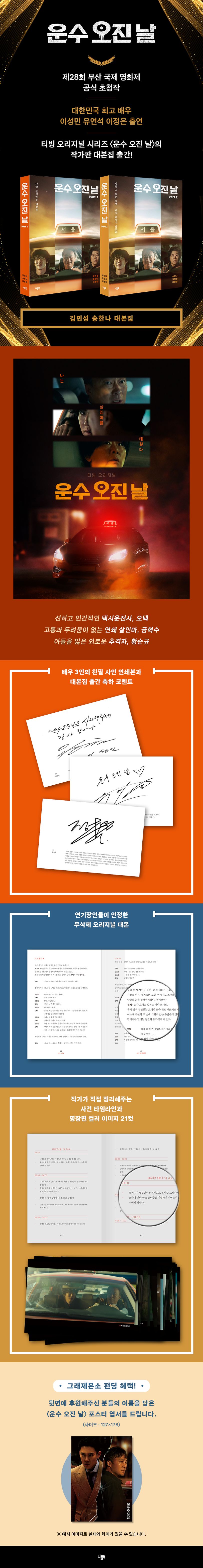 《운수 오진 날 대본집》은 Part 1과 Part 2, 두 권으로 구성돼 있으며, 각 권에는 본편에서 바뀌었거나 삭제된 장면과 대사가 그대로 살아 있는 작가의 오리지널 대본과 이성민, 유연석, 이정은 배우의 사인 인쇄본이 실려 있다. 또한 Part 2에는 Part 1의 타임라인, 작가 pick 회차별 명장면 및 명대사, 스틸컷 등이 수록돼 있어 〈운수 오진 날〉의 애청자들에게 소장 가치가 큰 선물이 될 것이다.