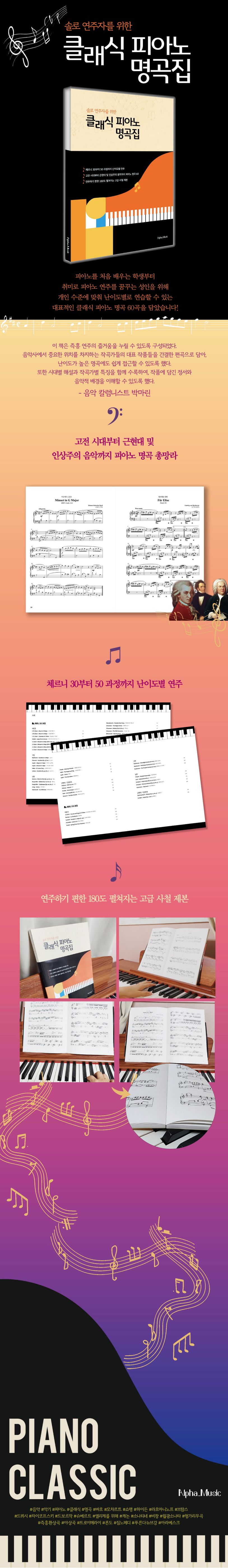 처음 피아노를 배우는 어린이부터 취미로 피아노를 배우려는 성인, 또는 어린 시절 피아노를 배우고 한동안 잊고 지내다 다시 피아노를 연주해 보고 싶은 학습자들이 자신의 수준에 맞는 곡을 선택하여 난이도별로 연습해 볼 수 있습니다. 또한 바흐, 모차르트, 베토벤, 쇼팽, 드뷔시 등 각 시대를 대표하는 작곡가들의 명곡을 통해, 클래식 음악의 흐름과 스타일의 변화를 자연스럽게 체험할 수 있도록 구성하였습니다. 한편 고급 사철 양장제본 형식을 도입하여 180도 자유롭게 펼쳐져서 피아노 연주 시 편리하게 활용할 수 있습니다.