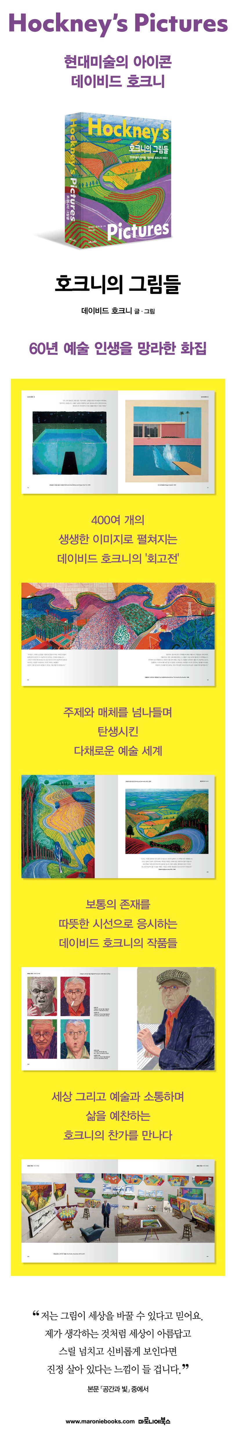 20세기를 대표하는 현대 미술의 거장이자 역대 가장 영향력 있는 예술가 데이비드 호크니. 『호크니의 그림들』은 초기부터 가장 최근에 이르는 호크니의 작품을 망라한 화집이자 ‘회고전’이다. 삶을 사랑하는 호크니가 수십 년 동안 구축해 온 고유한 예술 세계가 480여 개의 작품과 발화를 통해 황홀하게 펼쳐진다. 자연, 공간, 빛, 친구, 가족 등을 소재로 다루고 회화, 드로잉, 무대 디자인, 사진, 판화 등 매체를 넘나들며 열정적으로 세상을 탐구하는 호크니는 자신의 예술로 삶을 사랑한다는 것의 의미를 표현하고 전달한다.