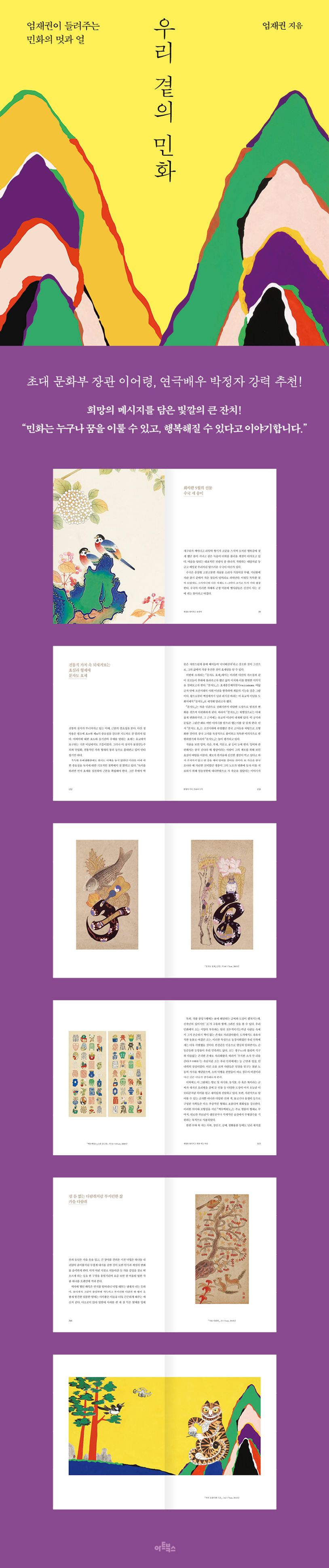 이런 민화를 감상하는 관점은 크게 두 가지로 나뉜다. 하나는 그림 속 도상을 살피고 그 뜻을 헤아려 그림을 ‘해석’하는 것이고, 다른 하나는 민화를 온전히 회화적 관점으로 살펴 표현과 채색 기법을 들여다보는 것이다. 둘 중 어느 쪽 감상법이 옳은가에 대한 갑론을박은 사실 큰 의미는 없다. 그보다 중요한 것은 민화가 한국 회화사에서 ‘서민’과 공존하면서 발전한 서민 미술이라는 점이고, 장롱이며 베갯잇, 이불은 물론이고 흔히 사용하던 부채와 골무에 이르기까지 우리네 집 안 곳곳, 일상 소품 등 다양한 장소와 물건을 장식하던 장식 미술로서 항상 우리 곁에 머물렀던 그림이라는 점이다. 민화가 우리 삶 속 가장 깊은 곳까지 스며든 데는 그림에 담긴 희망의 메시지가 우리의 마음에 큰 울림을 주기 때문일 것이다. 그런 민화를 지난 40여 년간 널리 알리고자 노력해온 작가 엄재권이 현대의 붓으로 직접 그려낸 그림 80여 점을 듬뿍 담은 책을 출간했다. 그림이 품고 있는 복된 의미를 비롯해 우리 주변, 사람 냄새 가득 풍기는 소소한 이야기를 맛깔나게 곁들인 『우리 곁의 민화』는 민화를 한층 살갑게 감상하는 법을 알려준다.