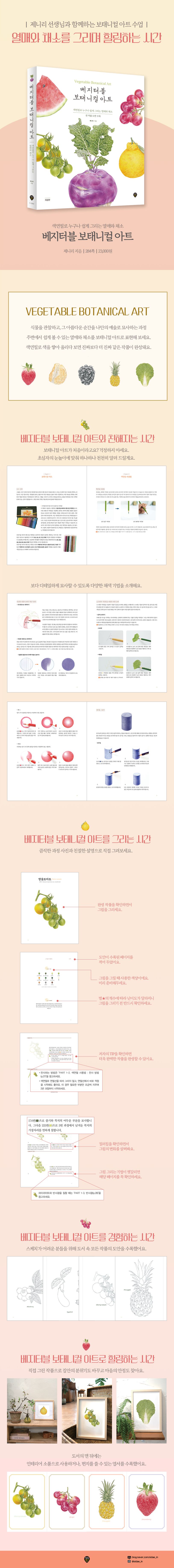 『베지터블 보태니컬 아트』는 총 4가지 파트로 구성되어 있습니다. 파트 1. 보태니컬 아트와 친해지는 시간에서는 보태니컬 아트를 처음 시작하는 초심자들을 위한 도구 선택법, 색연필 사용법부터 식물에 입체감을 줄 수 있는 반사광 표현 방법과 식물의 구조, 원예 작물의 분류 등 본격적으로 그림을 그리기 전에 알아두어야 하는 내용을 수록했습니다. 파트 2. 보태니컬 아트를 그리는 시간:초급편에서는 총 15가지의 열매와 채소를 그리는 방법과 저자만의 특별한 노하우를 담았고, 파트 3. 보태니컬 아트를 그리는 시간:중급편에서는 초급편에서 사용하지 않았던 다양한 채색 기법은 물론 더욱 심화된 디테일 묘사 방법을 소개하며 총 10가지의 열매와 채소를 담았습니다. 파트 4. 보태니컬 아트를 경험하는 시간에서는 도서에서 소개한 모든 작품의 도안을 수록해 직접 따라 그릴 수 있도록 구성하였습니다. 도서의 맨 뒤에는 인테리어 소품으로 사용하거나 소중한 사람에게 편지를 쓸 수 있는 작은 엽서도 추가했습니다.