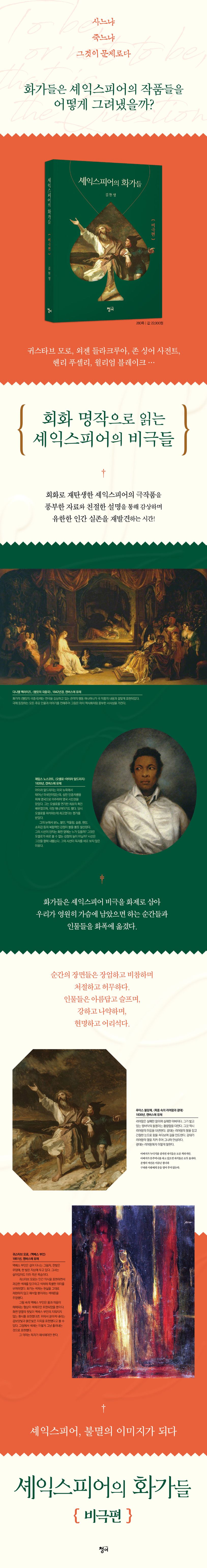 머리말4글을시작하며171『햄릿』Hamlet,1599~16011막“나는네아비의혼령이다”282막“천사같은내영혼의우상,가장아름다운오필리아에게”413막“사느냐,죽느냐,그것이문제로다”554막“오필리아의화관은흐느껴우는시냇물속으로떨어져버렸어”725막“난그입술에얼마나자주입을맞췄는지몰라”922『오셀로』Othello,1603~41막“시커먼늙은숫양이새하얀암양을……”1062막“죽는다면지금죽는것이제일행복할지몰라”1213막“난질투같은건하지않는다네……”1334막“넌갈보가아니더란말이냐?”1405막“먼저촛불을끄자,그런다음생명의불을……”1473『리어왕』KingLear,16051막“저는아버님을천륜에따라사랑하옵니다”1642막“나에게옷과잠자리와음식을다오”1753막“바람아불어라,네뺨이터지도록불어라!”1824막“나는한치도어김없는왕이지!”1915막“코델리아야,잠깐만,잠깐만기다려다오!”2014『맥베스』Macbeth,1606~7?1막“쉬!요술이걸렸다”2182막“내게칼을줘요!”2343막“욕망이이루어져도만족이없구나”2444막“불어나라,늘어나라,고통과쓰라림아!”2555막“인생은걸어다니는그림자……”260참고문헌274찾아보기277접기