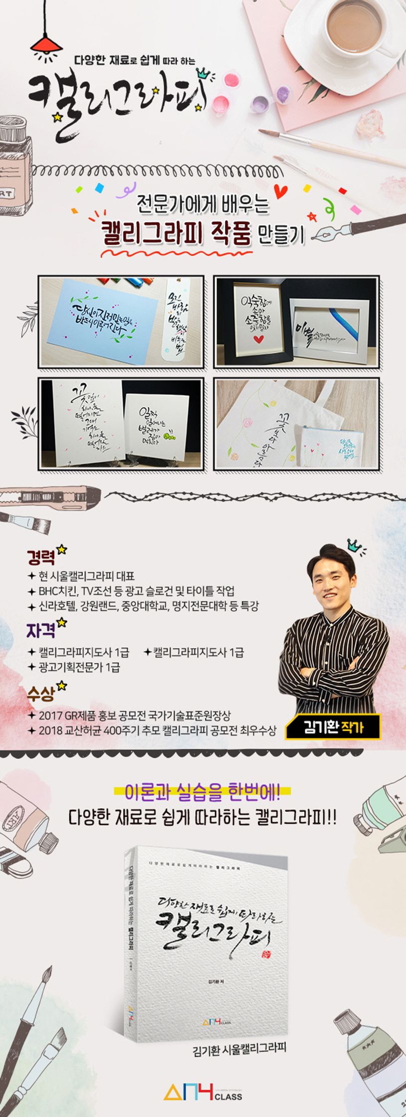 저자 김기환은 현재 시울캘리그라피의 대표이며, “상품이 아니라 작품을 만듭니다”라는 슬로건을 바탕으로, 캘리그라피 입문 과정부터 전문가 과정까지 다양한 강의를 하고 있다.