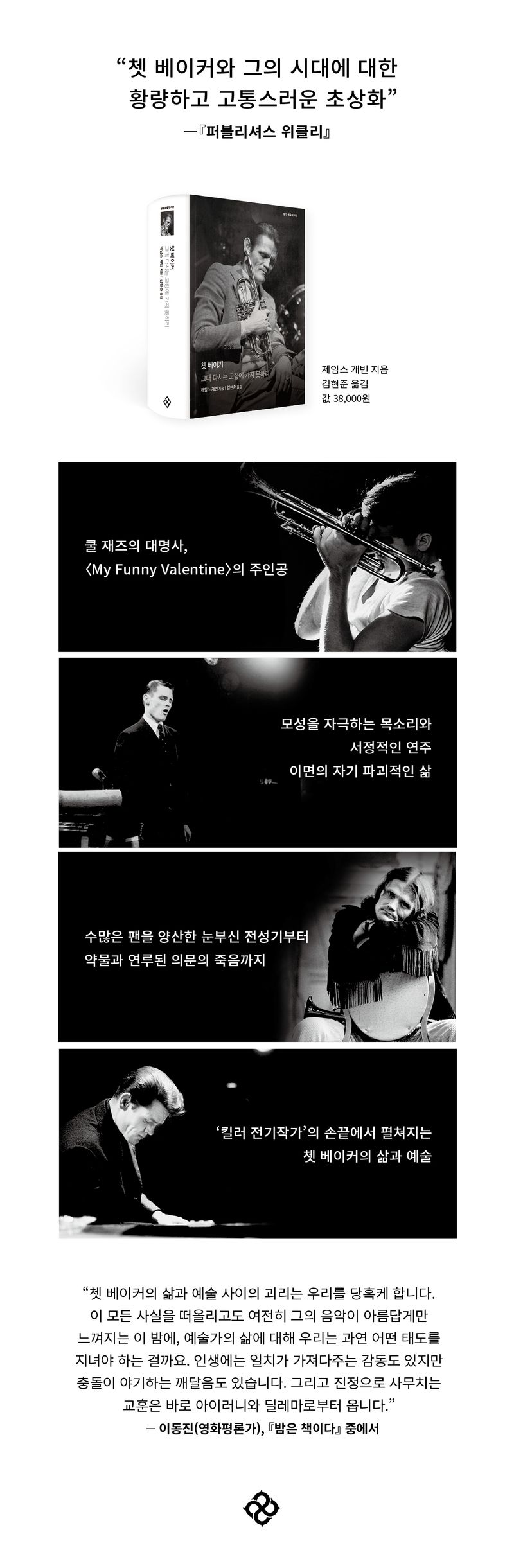 〈My Funny Valentine〉으로 잘 알려진 쳇 베이커는 천부적인 감각을 지닌 음악가였다. 부드럽고 서정적인 연주와 모성을 자극하는 목소리로 사람들을 사로잡았지만 동시에 그는 수십 년간 마약을 끊지 못했고, 수많은 동료 음악가와 연인들에게 돌이킬 수 없는 상처를 준 인물이었다. 이 책은 쳇 베이커의 주변 인물들과 나눈 인터뷰와 미발표 자료를 아우르는 방대한 조사를 통해 모순에 휩싸인 한 인간의 생애와 예술 세계를 파헤친다. 비운의 뮤지션이 마주했던 삶의 공포와 혼란, 음악적 성취와 몰락이 유럽과 미국을 오가며 치열하게 탐구한 저자의 펜 끝에서 생생하게 펼쳐진다.