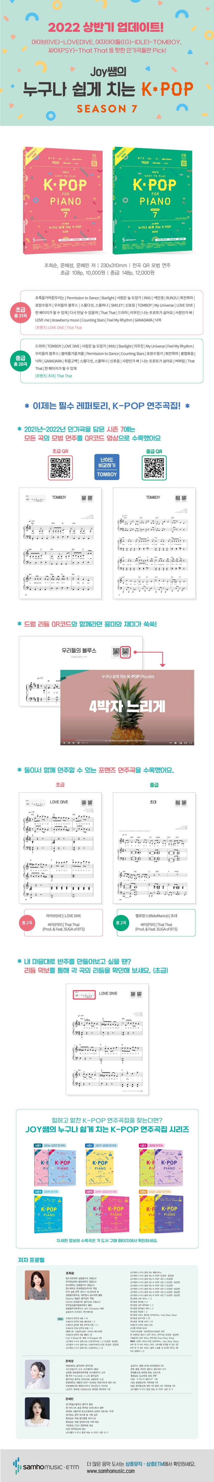 아이브(IVE), (여자)아이들, 싸이(PSY), 방탄소년단 등 K-POP 선두 주자들의 최신곡을 모은 연주곡집이다. 2017년도부터 꾸준히 업데이트 중인 ‘Joy쌤의 누구나 쉽게 치는 K-POP’ 도서는 이번 시즌7에 2021년 하반기부터 2022년 상반기까지의 인기곡을 담았다. 이전 시즌과 다르게 모든 곡에 QR코드 모범 연주 영상을 수록하여 연주에 도움이 될 수 있도록 하였으며, 곡마다 수록된 드럼 리듬과 함께 연주하면 더욱더 생동감 넘치는 연주를 할 수 있다. 또한, 둘이서 함께 연주할 수 있는 포핸즈 곡까지 수록하였다. 중급 버전은 체르니 100 후반~체르니 30번의 난이도로 전곡의 분량을 자르지 않고 편곡했으며, 코드가 상세히 기재되어 있다.