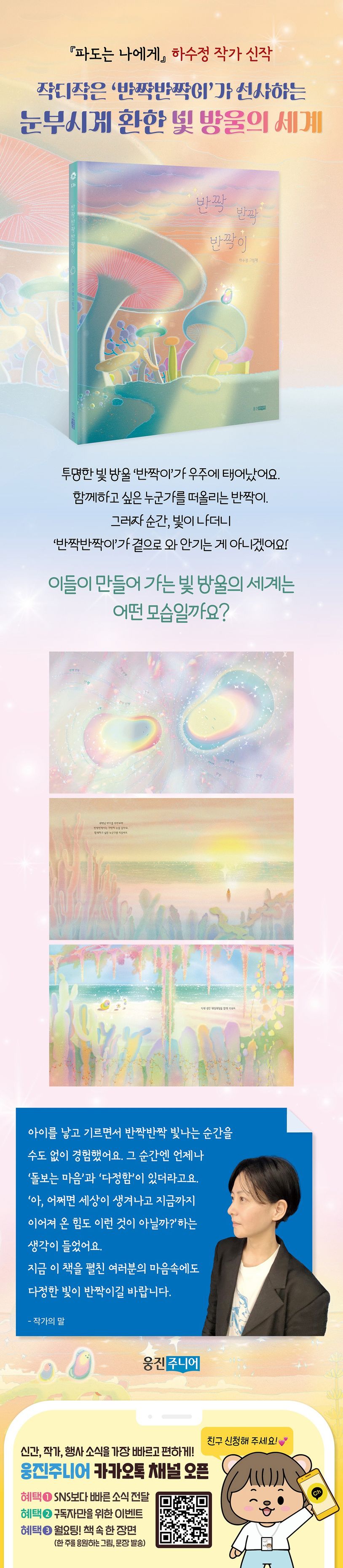 깜깜한 어둠 속, 우주의 첫 번째 생명이 태어납니다. 바로 투명한 빛 방울 ‘반짝이’예요. 분홍 바다를 만나면 분홍빛으로 반짝, 파란 하늘을 만나면 파란빛으로 반짝이지요. 그때 바다 한가운데 또 다른 빛이 보여요. 무엇일까요? 반짝, 반짝, 반짝. 어둠을 걷어 낸 후, 눈부시게 환한 빛 방울의 세계가 펼쳐집니다.