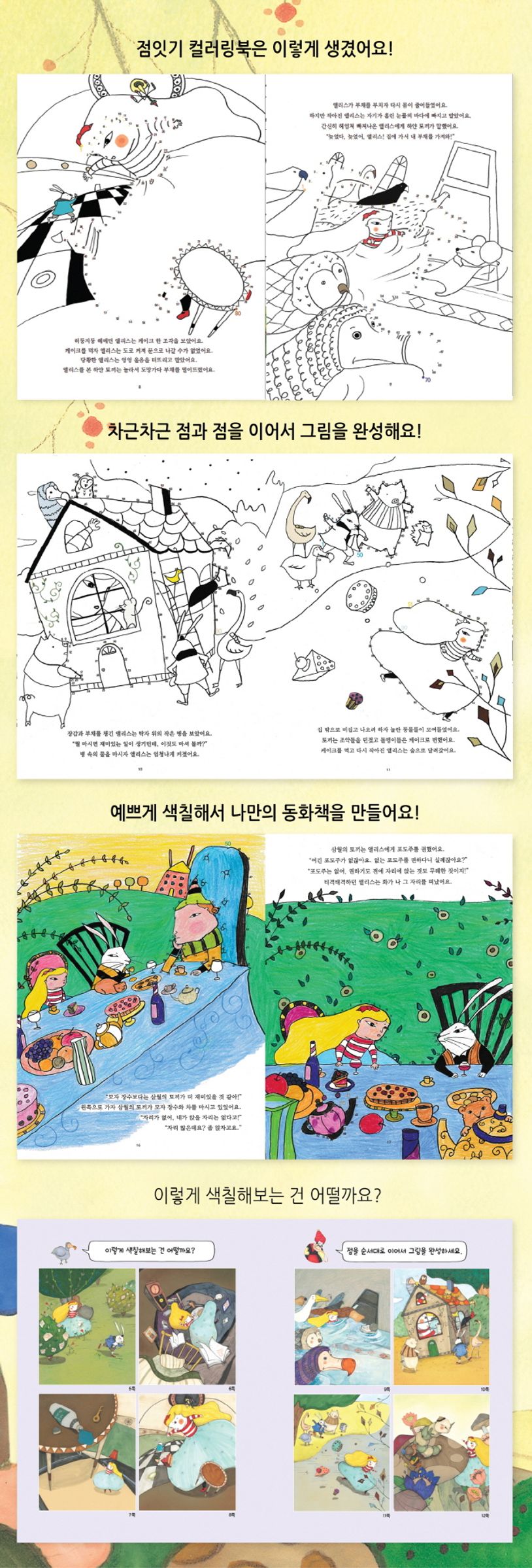 집중력과키워주는점잇기와색칠놀이가있는이야기놀이책!예쁘게색칠해서나만의동화책을완성해보세요!책소개◎놀이를통해집중력을키워주는점잇기![집중력을키워주는점잇기컬러링북]은점과점을잇는단순한그리기활동을넘어점과점을잇고선을만들어그림을그리는활동을통해집중력을키워주는놀이책입니다.크고작은부분들을연결하고색칠해가면서아이들은정교한손놀림과집중력을기를수있습니다.또한점끼리정확하게잇는연습을통해눈과손이함께적응하면서결과물을만들어내는힘을길러주고,아직미숙한손가락의힘을키워연필을잡는힘도길러줄것입니다.◎자연스럽게수개념을익히는점잇기놀이!아직우리아이에게어려운숫자세기!수개념은억지로가르친다고익혀지는건아니랍니다.[집중력을키워주는점잇기컬러링북]을통해차근차근숫자를연결하다보면자연스럽게수개념도익힐수있어요.◎내아이가직접만든세계명작!《거울나라의앨리스》와더불어전세계적으로알려진루이스캐럴의명작동화《이상한나라의앨리스》.즐거운상상의문을두드리는장면으로가득하여,전세계어린이들의사랑을널리받아온《이상한나라의앨리스》이야기를내손으로직접그리고예쁘게색칠하여나만의《이상한나라의앨리스》를완성해보세요.