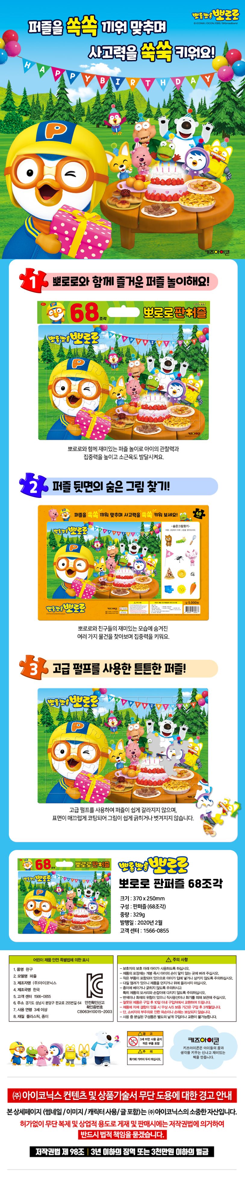 『뽀로로 판퍼즐 68조각』을 통해 뽀로로와 함께 재미있는 퍼즐 놀이로 아이의 관찰력과 집중력을 높이고 소근육 발달에도 도움이 된다. 뽀로로와 친구들의 재미있는 모습에 숨겨진 여러 가지 물건을 찾아보며 집중력을 키울 수 있다.