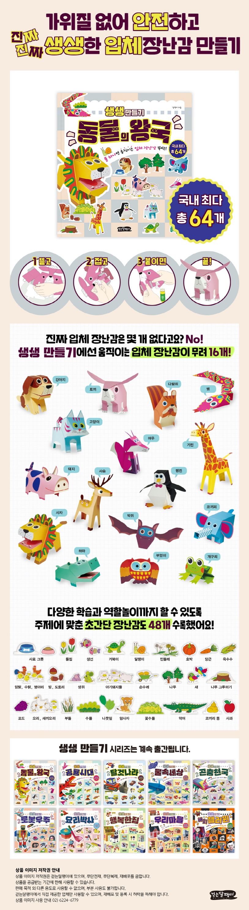 걷는달팽이의 〈생생 만들기 - 동물의 왕국〉은 아이들이 좋아하는 동물과 자연, 사물을 총 64개로 알차게 수록했습니다. 머리를 까딱까딱 움직이는 여우, 고개를 아래로 숙이는 기린, 무시무시한 입을 쫘악 벌리는 사자, 날개를 팔락팔락 움직이는 부엉이 등 움직이는 입체 장난감을 16개나 수록하여 더욱 재미있어요.