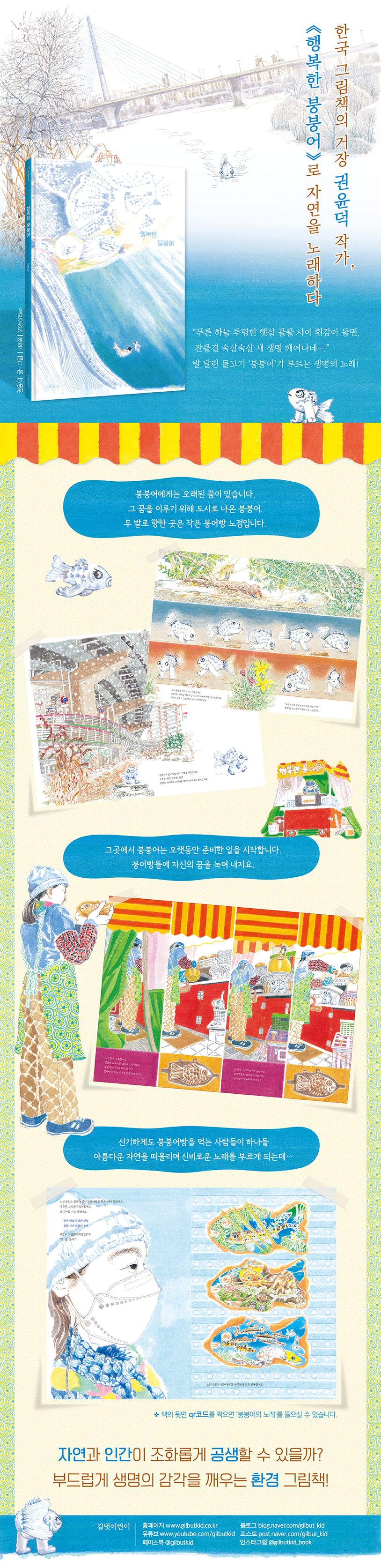 전쟁과 폭력의 참상을 마주하고 평화의 메시지를 예리한 시선으로 포착해 온 권윤덕 작가의 새 그림책 《행복한 붕붕어》가 출간되었습니다. 자연 속 생명의 목소리를 담아낸 이번 그림책은 발 달린 물고기 ‘붕붕어’를 통해 자연과 분리된 채 환경을 파괴하며 살아가는 우리에게 함께 살아가자는 공존의 메시지를 건넵니다.