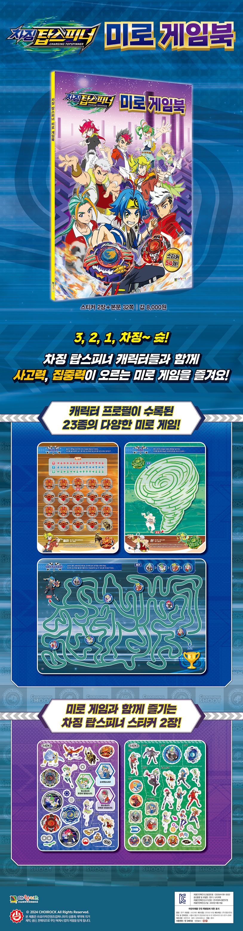 차징 탑스피너 캐릭터들의 미니 프로필이 수록된 23종의 미로 게임을 만나 보세요. 규칙 미로, 알파벳 미로 등 다양한 형태의 미로 게임으로 사고력과 집중력을 키우고, 미로 게임이 더 즐거워지는 탑스피너 캐릭터 스티커 2장으로 스티커 놀이까지 함께 해 보세요.