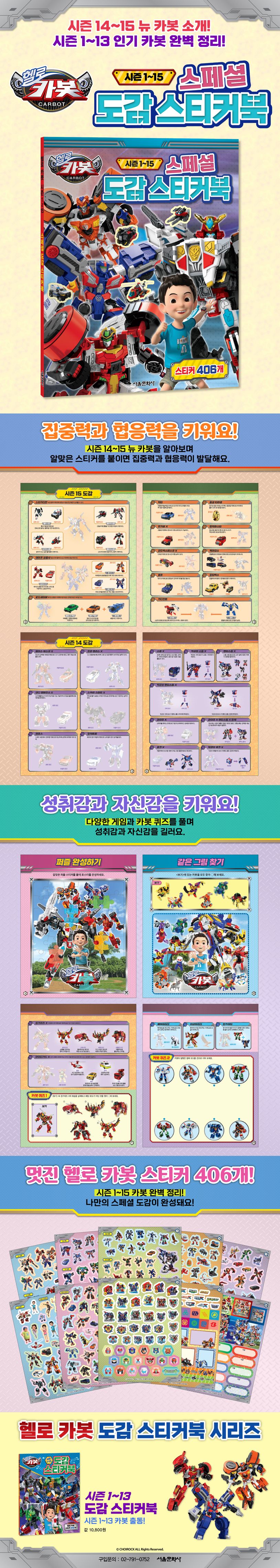 시즌 1부터 15까지 다양한 카봇을 한 권에 담은 《헬로 카봇 시즌 1~15 스페셜 도감 스티커북》이 출간되었어요.