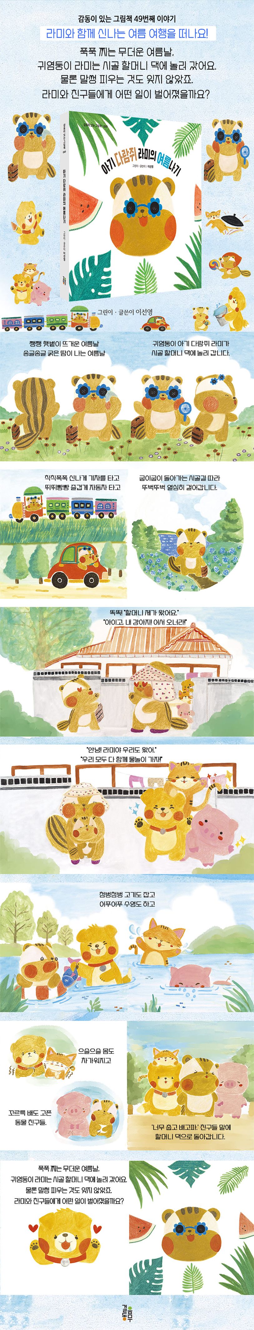 영유아들에게 친숙한 동물들을 주인공으로 설정했으며 귀염둥이 아기 다람쥐 라미와 동물 친구들의 여름나기 모습을 아름다운 시골 풍경, 여름철 먹거리와 어우러지도록 구성했습니다. 그림책을 읽고 즐기며 여름의 날씨와 생활 모습, 먹거리 등 여름과 관련된 다양한 정보를 재미있게 익힐 수 있습니다. 또한 이 그림책에는 의성어, 의태어, 색채어들이 풍부하게 들어 있어 재미있게 말놀이를 하며 즐길 수 있고, 3음보의 운율감이 느껴져 편안하고 리듬감 있게 볼 수 있습니다.