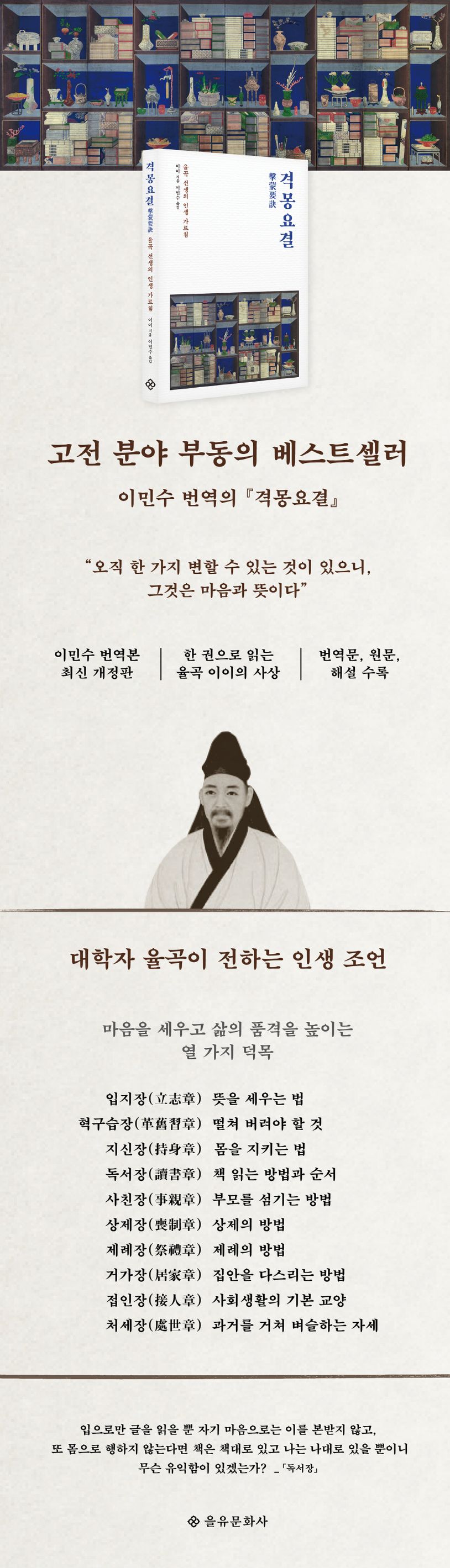 오랫동안 고전 분야 부동의 베스트셀러 자리를 지킨 이민수 번역의 『격몽요결』 개정판이 출간되었다. 『격몽요결』은 조선 시대의 대학자이자 정치가인 율곡 이이가 후학 교육을 위해 집필한 정신 수양서로, 자신을 갈고닦는 법의 전범을 보여 준 명저다. 이 번역서는 ‘부록’을 포함해 『격몽요결』 원전을 충실히 번역하고, 원문을 싣고 해설과 주석을 덧붙였다. 이번에 동시대 독자와 더욱더 원활히 호흡하기 위해 표지를 바꾸고 본문을 더 가독성 있게 다듬은 개정판을 선보인다. 독자들은 이번 개정판을 통해 오랫동안 사랑받은 고전의 품격을 여실히 느낄 수 있을 것이다.