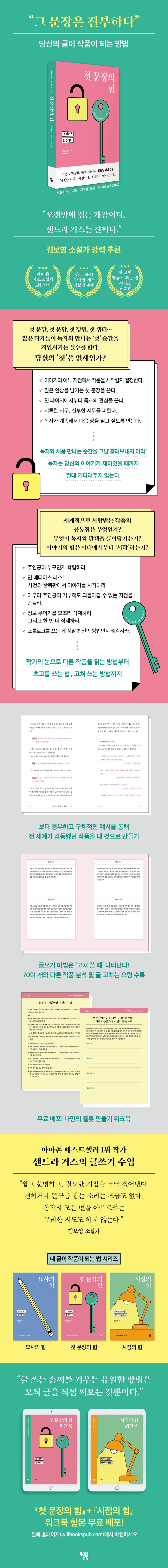 아마존 베스트셀러 1위 작가 샌드라 거스는 지금까지 쓴 수십여 편의 소설과 세계적으로 사랑받은 작품들의 모범 예시를 들어 좋은 이야기의 서두에 숨은 비밀을 공개한다. 문학 출판사 선임 편집자로서 검토한 원고들, 특히 출간을 거절한 원고들의 치명적인 단점을 분석하여 많은 작가들이 저지르는 실수도 깔끔하게 정리했다.