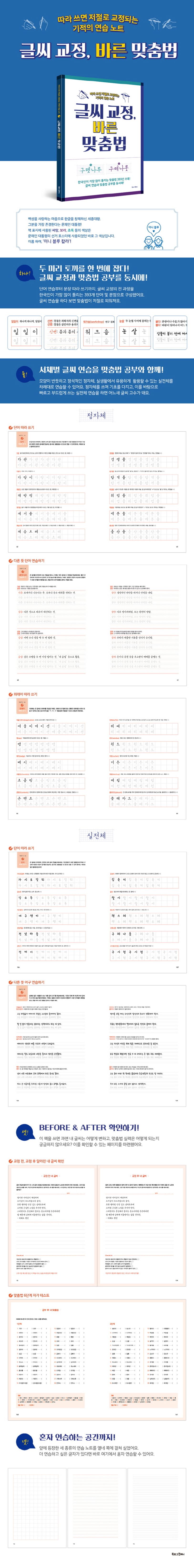 반듯한 글씨체와 바른 맞춤법을 동시에 잡는 일석이조 연습장『글씨 교정, 바른 맞춤법』. 글씨 교정과 맞춤법 공부를 동시에 할 수 있도록 구성되어진 이 책은 이음새 연습, 자모음 위치와 크기를 조절하는 연습을 하여 글씨 연습의 초석을 닦은 후, 바른 글씨의 기초를 닦는 정자체와 유용하게 활용할 수 있는 실전체를 순서대로 연습할 수 있다. 큰 글씨를 먼저 써서 손의 힘을 기른 후 작은 글씨를 쓰도록 체계적으로 구성하여 독자를 손글씨 고수의 길로 인도한다.