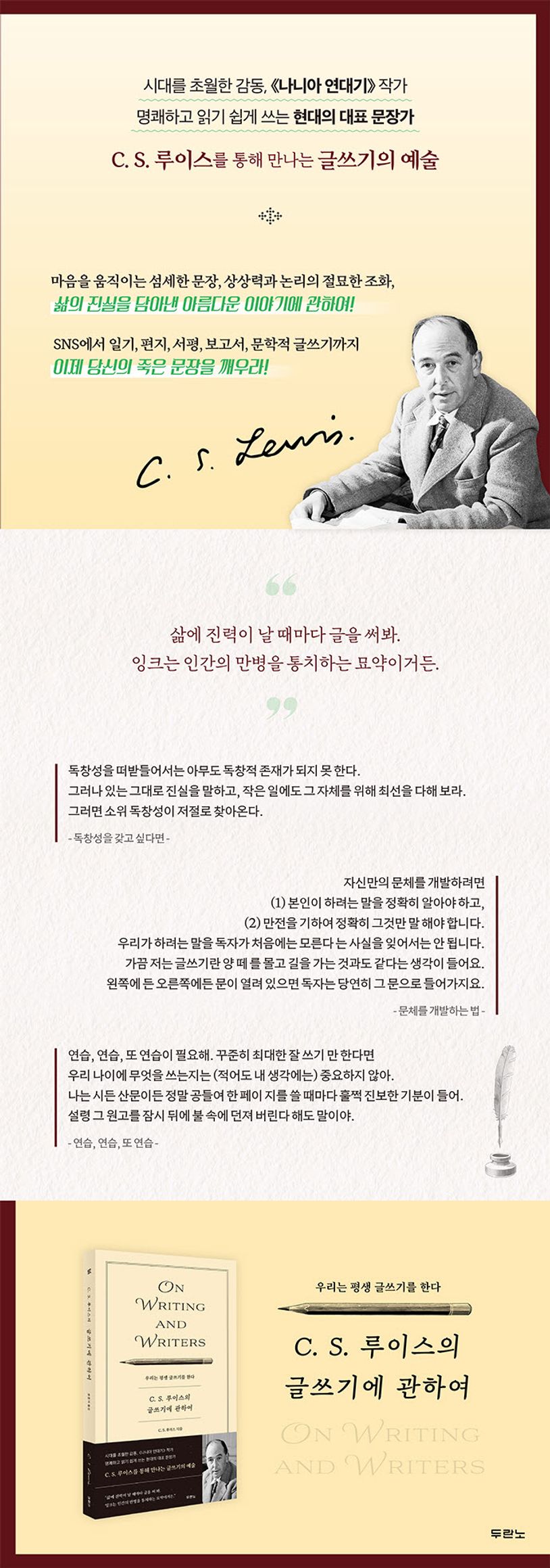 전 세계적으로 1억 부 넘게 판매된 아동 판타지 소설 《나니아 연대기》를 비롯해, 《스크루테이프의 편지》, 《순전한 기독교》 등 수많은 인생에 감화를 끼치며 고전의 반열에 오른 명작들의 저자이자, 옥스퍼드와 케임브리지에서 오랜 시간 영문학을 가르쳤던 존경받는 교수요 학자, 20세기 최고의 기독교 변증가로 칭송받는 C. S. 루이스. 그가 평생 쓴 다양한 편지와 책, 에세이 등에서 “글쓰기 및 글 쓰는 사람(작가)”에 관련한 그의 조언과 지론을 100편가량 엄선했다.