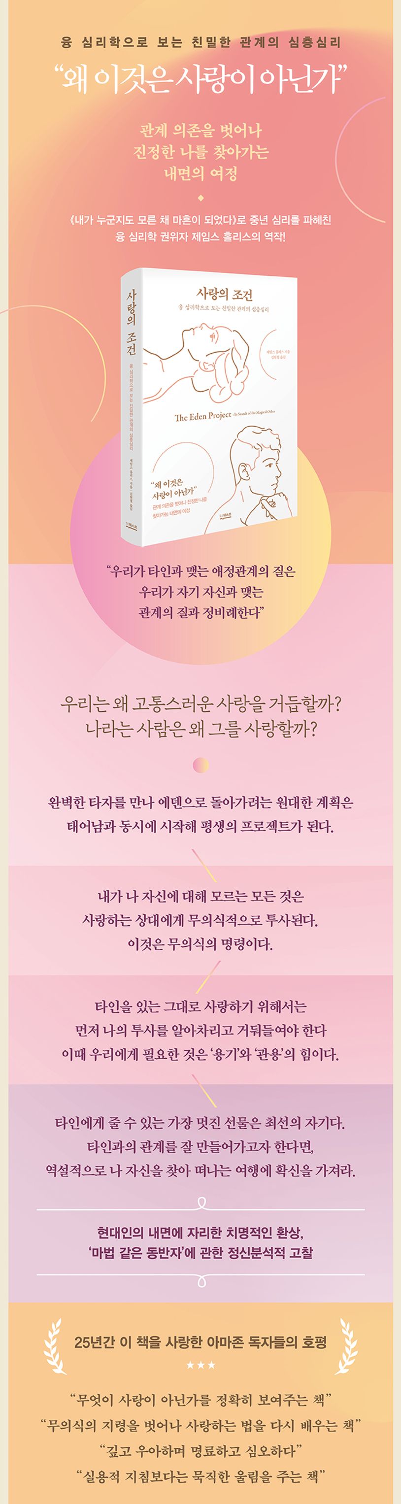 융 심리학의 권위자 제임스 홀리스는 《내가 누군지도 모른 채 마흔이 되었다》에서 중년의 위기와 진정한 자기와의 만남을, 《남자로 산다는 것》에서 남성의 생애와 심층심리를 고찰해왔다. 신간 《사랑의 조건》에서는 부부, 연인 등 친밀한 관계에서 비롯되는 심리적 고통의 원인을 파고든다.