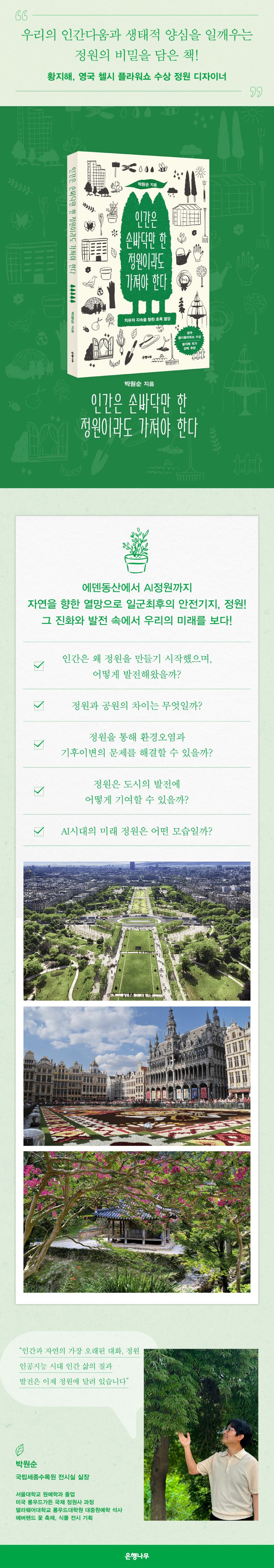 국립세종수목원 전시원 실장이자 국내외 유수의 정원에서 가드너로 활동해온 저자 박원순이 〈조선일보〉 칼럼 ‘박원순의 도시의 정원사’을 재구성하여 도시와 정원의 역사와 문화, 사회와 함께 변모해가는 정원의 미래에 대해 소개한 책 《인간은 손바닥만 한 정원이라도 가져야 한다》(은행나무刊)가 출간되었다. 에덴동산처럼 낙원 혹은 이상향을 상징했던 정원은 베르사유 궁전과 같이 소수 권력자들의 전유물로서 명성을 떨쳤다. 그러나 근대를 거치며 ‘모두의 정원’으로서 그 공적 기능이 강화되었는데, 최근에는 교육·치유·전시·관광 등 다양한 목적을 실현하고 어린이와 장애인, 여행객 등 다양한 계층을 위한 창의적 공간으로 변모해가고 있다. 저자는 도심 속 자투리 정원부터 수목원과 식물원, 국내외 정원 박람회까지 다양한 문화적 공간으로 진화해가는 정원의 현재를 살펴보고, 환경오염과 기후 이변, 인간성의 상실 등 위기에 처한 우리에게 필요한 치유와 지속가능성의 지혜를 정원에서 탐색해가고 있다.