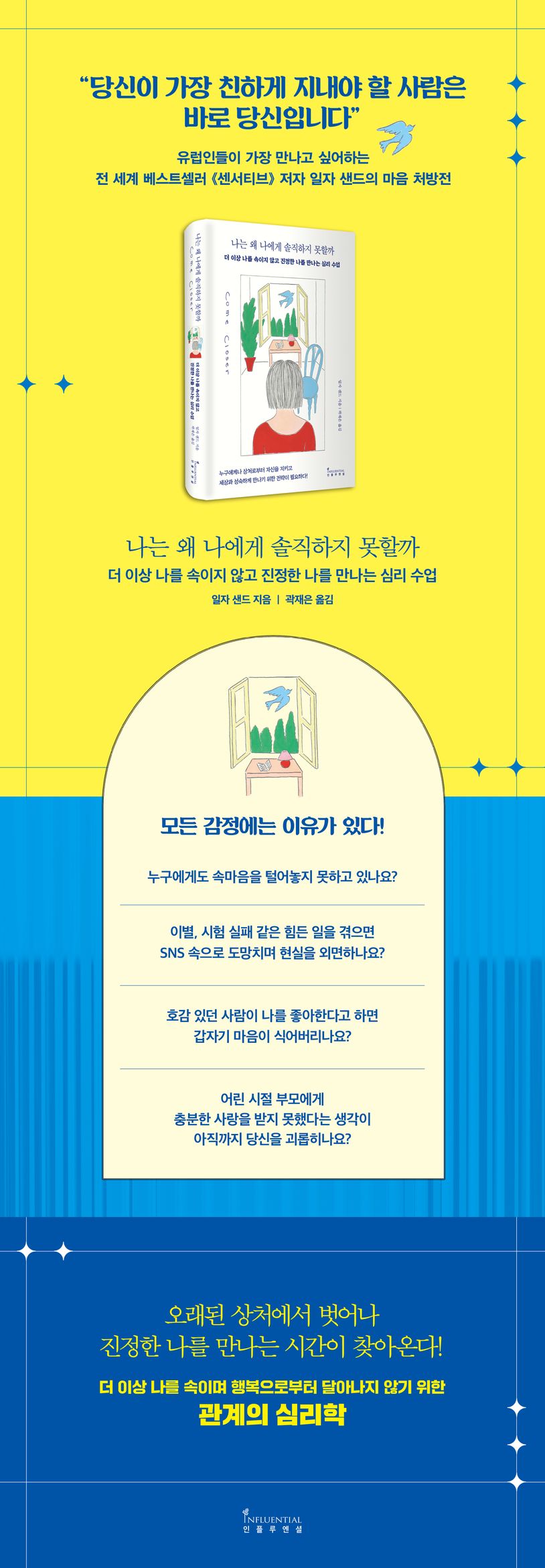 심리 상담 베스트셀러 《센서티브》의 저자이자 유럽인들이 가장 만나고 싶어 하는 심리상담사 일자 샌드(Ilse Sand)는 자신을 사랑하지 못하고 문제 상황에서 자꾸 도망치려고만 하는 사람들에게 이제는 미숙한 자기보호에서 벗어나 성숙한 자기보호로 나아가라고 말한다. 《나는 왜 나에게 솔직하지 못할까(Come Closer)》는 어른이 된 지금, 어릴 적 겪었던 마음의 상처를 어루만지고 회복할 수 있도록 자신의 목소리를 충분히 들어줄 것을 제안한다. 그리고 그를 통해 세상과의 진정한 만남을 누려보라고 권한다.