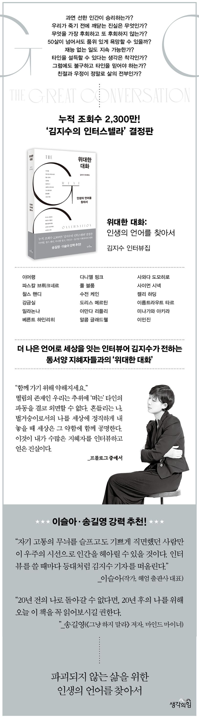 저자 김지수는 28년 차 기자로, 2015년부터 진행해 온 그의 인터뷰 시리즈 ‘인터스텔라’는 그동안 수백만 독자들의 신뢰와 사랑을 받아왔다. 《위대한 대화: 인생의 언어를 찾아서》는 그 결정판이라고 말할 수 있을 만큼, 여러 분야에서 두각을 드러낸 인물 18명을 선정하여 그들의 호기심과 낭만, 삶에 대한 지혜를 가득 담아낸 인터뷰집이다. 이어령(문학평론가), 파스칼 브뤼크네르(소설가이자 철학자), 찰스 핸디(경영사상가) 등 시대의 어른들과 이민진(작가), 다니엘 핑크(미래학자), 폴 블룸(심리학 교수), 수전 케인(작가)과 같은 주목받는 지성인, 전문가들이 대거 포진해 있다. 김지수만의 서정적이고 통찰력 있는 질문과 꾸밈없고 진솔한 대답으로 완성된 ‘동서양의 지혜자’ 18인과의 깊고 다정한 대화는 오래 들여다볼수록 더 빛이 난다.