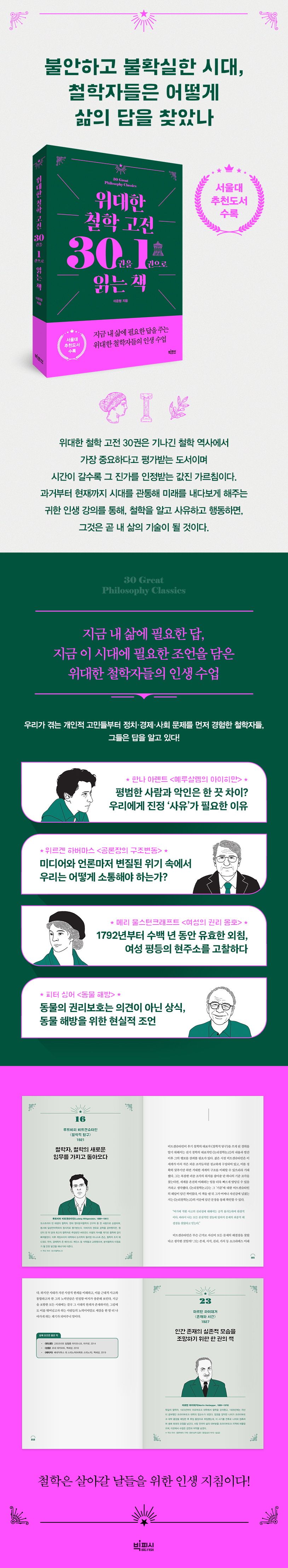 기나긴 철학의 역사에서 가장 중요하다고 평가받는 위대한 고전 30권은 현재를 살아가는 우리에게 꼭 필요한 ‘덕목’이 담겨 있다. 이 책은 소크라테스, 니체, 한나 아렌트, 미셸 푸코, 비트겐슈타인 등 시간이 갈수록 더 값진 가르침을 주는 철학자들의 고전 30권을 1권당 7~8페이지 정도로 압축하여 소개한다. 삶에 대한 고민부터 시대적인 문제까지, 우리와 같은 상황을 먼저 경험하고 답을 찾아 나선 철학자들의 여정은 우리에게 살아갈 날들의 인생 지침을 건넨다. 이 책을 통해 철학을 알고, 사유하고, 행동하면 그것은 곧 내 삶의 기술이 될 것이다.