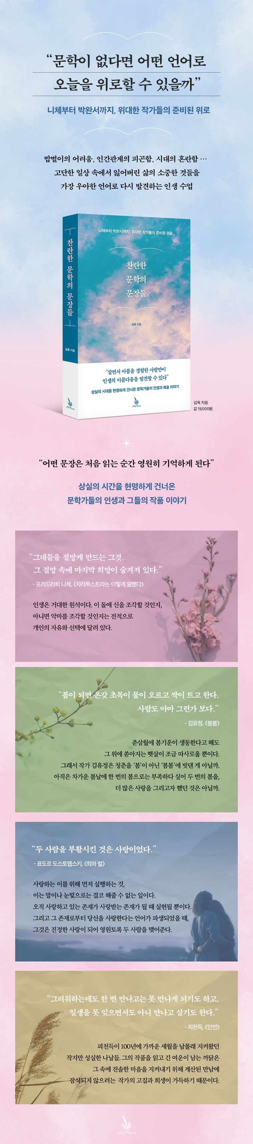 니체는 내 마음을 이해해줄 한 사람 혹은 그 무엇 하나만 있어도 의외로 버텨지는 게 삶이라고 했다. 아침에 일어나서 잠들 때까지 밥벌이를 위해 하고 싶은 일과 해야 할 일 사이에서 고민하고, 관계 속에서 휘둘리다 보면 내 삶을 지지해주는 것을 잊고 살게 될 때가 많다. 다행히도 우리에게는 문학이라는 기록이 있다.