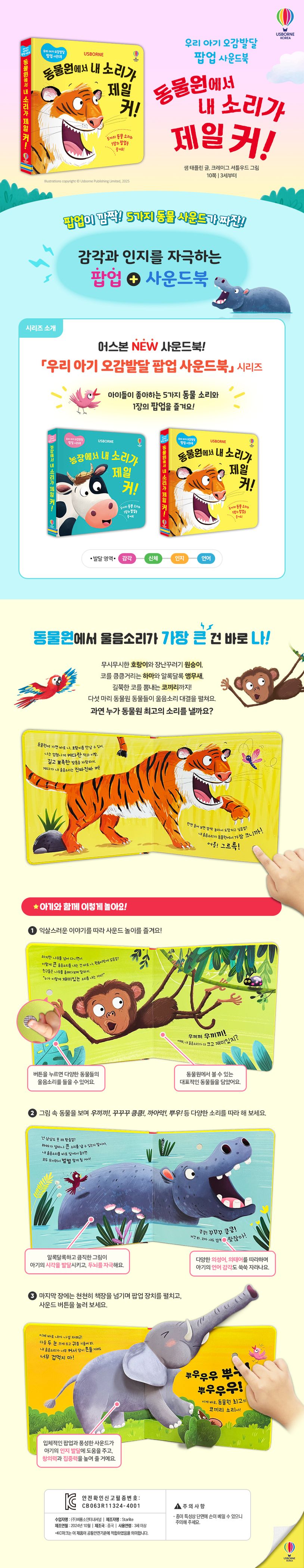 아이들이 좋아하는 다섯 가지 동물 소리와 팝업을 함께 즐기는 「우리 아기 오감발달 팝업 사운드북」 시리즈를 소개합니다. 동물원의 다섯 동물이 커다란 울음소리를 뽐내요! 익살스러운 이야기를 따라가며 버튼을 누르면 다섯 가지 입체적인 소리가 흘러나와요. 마지막 책장을 넘기면 놀라운 팝업이 펼쳐지며 사운드와 함께 다채롭게 즐길 수 있지요. 팝업과 함께 즐기는 풍성한 사운드는 아이들의 호기심을 자극하고, 책 읽기의 즐거움을 느끼게 해 준답니다.