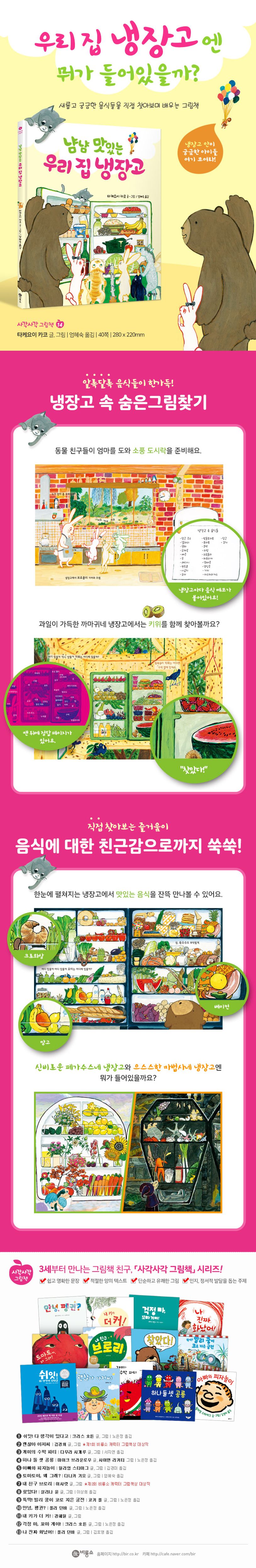 『냠냠 맛있는 우리 집 냉장고』는 저자가 냉장고를 자꾸 열어 보고 싶어 하는 네 살 난 큰아들을 보고 만든 그림책으로, 엄마를 도와 소풍 준비를 하는 동물 친구들의 각기 다른 냉장고가 차례로 소개된다. 싱싱한 야채가 가득한 토끼네 냉장고, 새콤달콤한 과일이 가득한 까마귀네 냉장고, 신비로운 페가수스네와 으스스한 마법사네 냉장고까지! 냉장고 문을 열 듯, 책장을 넘겨 한눈에 펼쳐지는 음식들을 함께 찾다 보면 음식 이름을 자연스레 익힐 수 있다.