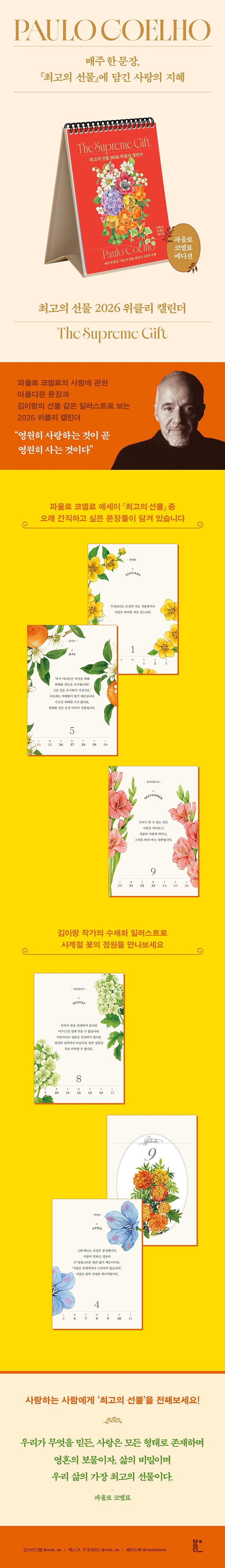 사랑에 관한 빛나는 사유로 가득한 파울로 코엘료의 『최고의 선물』을 365일 함께할 수 있는 위클리 캘린더를 선보인다. 전 세계 170개국에서 88개 언어로 번역되어 3억 2천만 독자의 마음을 사로잡은 우리 시대 가장 영향력 있는 작가 파울로 코엘료는 인생 최고의 선물은 ‘사랑’이라고 말한다. 『최고의 선물』은 세상에서 가장 아름다운 글 가운데 하나로 알려져 있는 종교 사상가 헨리 드러먼드의 저서 『세상에서 가장 위대한 것(The Greatest Thing in the World)』에서 작가가 영감을 받아 자유롭게 쓴 에세이로, 사랑에 관한 성찰과 깨달음을 깊은 울림을 주는 문장들로 담아냈다.