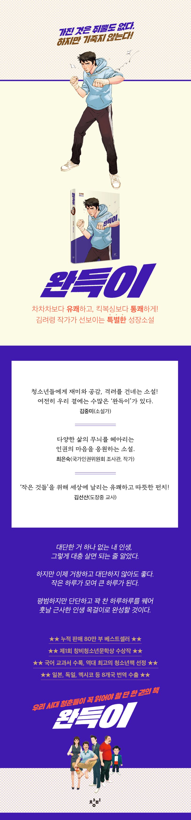 제1회 창비청소년문학상 수상작, 한국 청소년문학의 스테디셀러 김려령 장편소설 『완득이』가 출간 15주년을 기념해 특별 한정판 ‘펀치 에디션’을 선보인다. 15년간 전 세대의 많은 사랑을 받으며 국내에서만 80만 부 판매된 『완득이』는 일본, 독일, 멕시코 등 8개국에 번역 수출되며 해외 독자들에게도 큰 호응을 얻었다. 또한 YES24와 한겨레, 용인시와 김해시에서 ‘올해의 책’으로 선정된 바 있으며, 연극·뮤지컬·영화 등 다채로운 모습으로 종횡무진 활약하기도 했다.