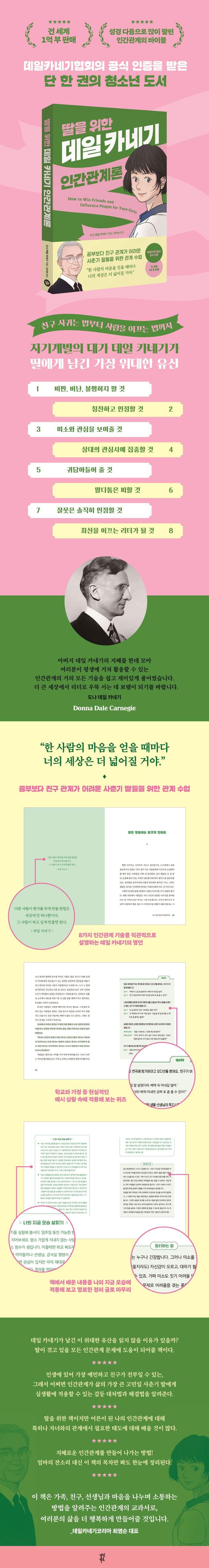 전 세계 1억 부 이상 판매된 인간관계의 바이블 『데일 카네기 인간관계론』이 사춘기 소녀들을 위해 새롭게 태어났다. 『딸을 위한 데일 카네기 인간관계론』은 전설적인 커뮤니케이션 멘토 데일 카네기의 철학을 바탕으로, 그의 친딸이자 데일카네기협회 이사장인 도나 데일 카네기가 오늘날의 십 대 여학생들이 학교와 가정 등 일상에서 적용할 수 있는 인간관계의 기술을 유쾌한 목소리로 풀어낸 책이다. 새로운 환경에서 쉽게 친구를 사귀지 못하는 아이, 친구 사이의 갈등을 극복하지 못해 힘들어하는 아이, 부모나 선생님과의 관계에서 어려움을 겪는 아이뿐만 아니라 탁월한 의사소통 능력을 기반으로 세상의 중심에 선 리더가 되고 싶은 딸들에게 이 책은 따뜻한 길잡이가 되어 줄 것이다.