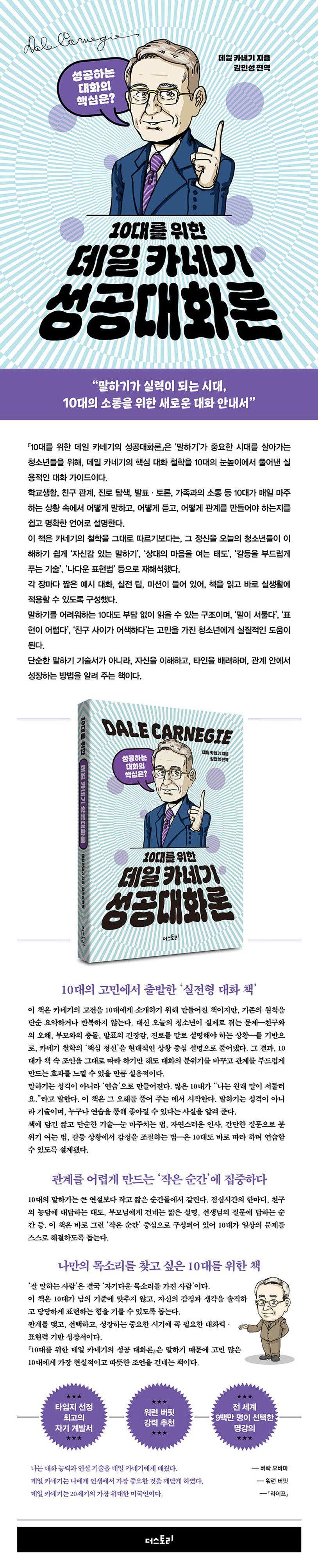 『10대를 위한 데일 카네기의 성공대화론』은 ‘말하기’가 중요한 시대를 살아가는 청소년들을 위해, 데일 카네기의 핵심 대화 철학을 10대의 눈높이에서 풀어낸 실용적인 대화 가이드이다.