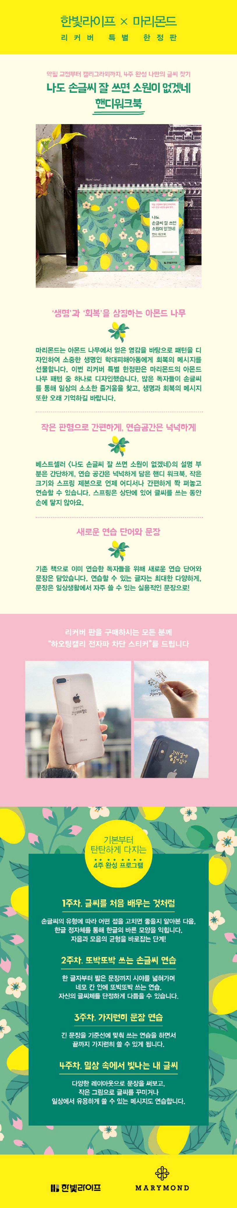 악필교정부터간단한캘리그라피까지단계별로차근차근연습할수있는<나도손글씨잘쓰면소원이없겠네>의핸디워크북.크기가작아가볍게들고다니며언제어디서나손쉽게글씨연습을할수있습니다.많은독자들이원했던스프링제본은,위로넘기는방식을채택하여글씨를쓰는동안스프링이손에닿지않도록했습니다.설명을읽을때는조금불편할수있지만글씨연습은훨씬편해졌습니다.