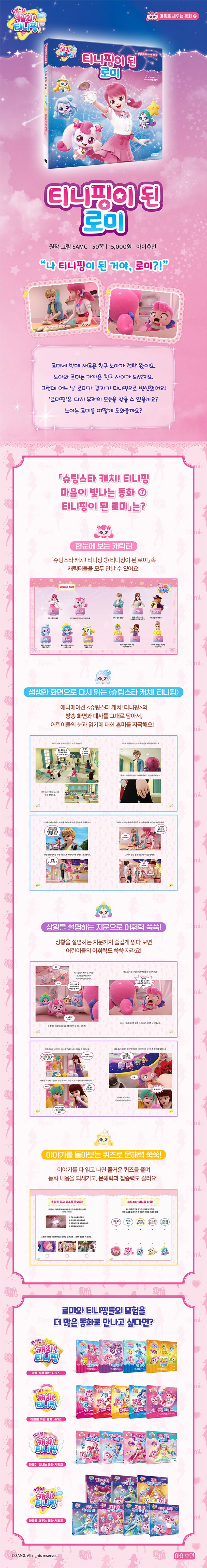 이번 『슈팅스타 캐치! 티니핑 마음이 빛나는 동화 ⑦ 티니핑이 된 로미』는 시즌 5에 새롭게 등장한 친구 노아의 이야기와 더불어 애니메이션 20화를 재구성한 그림책입니다. 실제 방송 화면과 캐릭터들의 대사를 그대로 담아 티니핑을 좋아하는 마음을 읽기로 연결했고, 다양한 우리말 어휘로 상황을 설명하는 지문이 더해져 어휘 발달에 도움이 되도록 했습니다. 『슈팅스타 캐치! 티니핑 마음이 빛나는 동화 ⑦ 티니핑이 된 로미』는 어린이들의 눈과 마음을 사로잡고, 상상력을 키워 주고, 읽기에 대한 흥미를 자극하며 즐겁게 집중력과 문해력을 기르게 해 줄 것입니다.