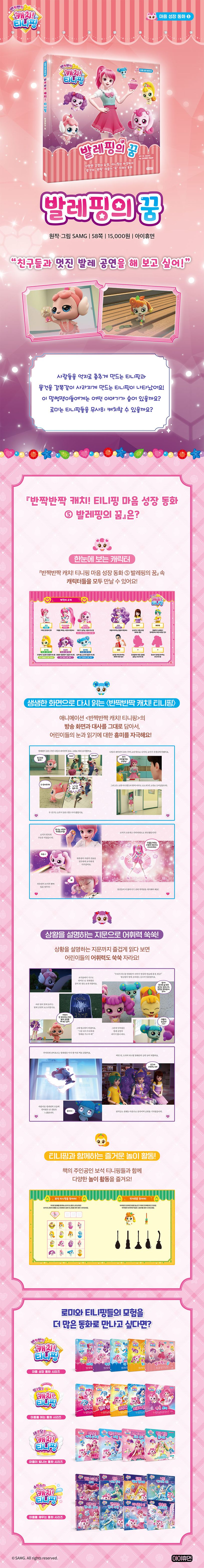 이번 『반짝반짝 캐치! 티니핑 마음 성장 동화 ⑤ 발레핑의 꿈』은 애니메이션의 8화와 22화를 담은 이야기로, 정리정돈의 중요성을 담은 싹싹핑 에피소드와 어린이들의 꿈과 상상력을 자극하는 발레핑 에피소드를 엮었습니다. 이야기를 모두 읽은 뒤에는 주인공 티니핑들과 함께하는 ‘퀴즈 풀기’, ‘선 긋기’ 등 활동으로 즐겁게 마무리합니다.