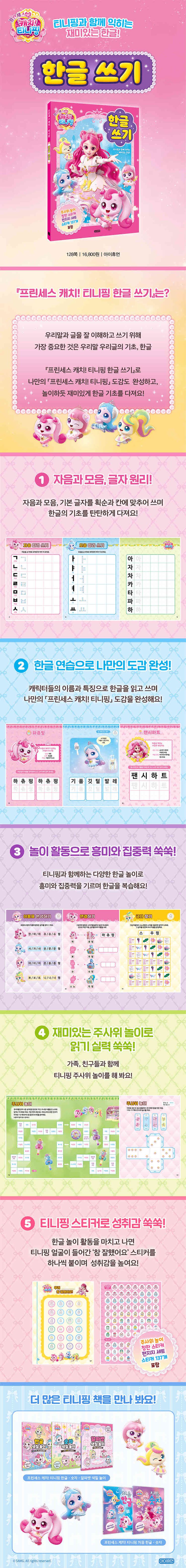 어린이들의 바른 성장을 돕는 책을 출간하는 아이휴먼이 새롭게 펴낸 『프린세스 캐치! 티니핑 한글 쓰기』는 어린이들이 한글 쓰기를 공부가 아닌 놀이처럼 느끼게 돕습니다. 이 책은 어린이들이 즐겁게 한글 기초를 쌓고, 나만의 〈프린세스 캐치! 티니핑〉 캐릭터 도감을 완성하며 성취감과 뿌듯함을 느끼고, 한글에 대한 흥미를 더하며 사고력과 집중력을 기를 수 있는 최고의 기초 한글 교재가 될 것입니다.