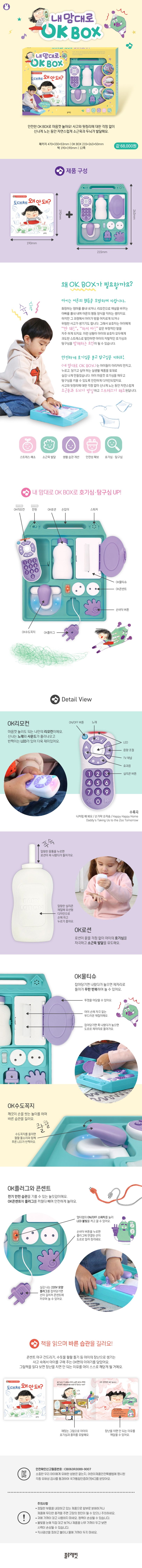 -실감나는OKBOX로호기심·탐구심UP!『내맘대로OKBOX』는아이들이이리저리만지고,누르고,당기고싶어하는실생활제품을토대로실감나게만들었습니다.아이마음껏호기심을채우고탐구심을키울수있도록안전하게디자인되었지요.사고와뒷정리에대한걱정없이신나게노는동안자연스럽게소근육과두뇌가발달하고스트레스가해소된답니다.-책을읽으며바른습관을길러요.콘센트마구건드리기,수돗물콸콸틀기등아이의장난으로생기는사고속에서아이를구해주는OK맨의이야기를담았어요.그림책을읽다보면장난을치면안되는이유를아이스스로깨닫게될거예요.-안전을최우선으로생각했습니다『내맘대로OKBOX』는유아의안전을최우선으로생각하여디자인하였습니다.어린이제품안전특별법에명시된각종유해성검사를통과하여KC인증을받았습니다.안전성이검증된제품으로아기와함께안심하고즐겁게사용하세요.·정밀한부품을내장하고있어제품을함부로분해하거나제품에무리한충격을주면고장의원인이될수있으니주의하세요.·귀에가까이대고사용하지마세요.청력이손상될수있습니다.·불빛을눈에직접대고보거나제품을너무가까이두고보면시력이손상될수있습니다.·직사광선을피하고불이나물에가까이두지마세요*인증유형:안전확인CB063R3089-9007