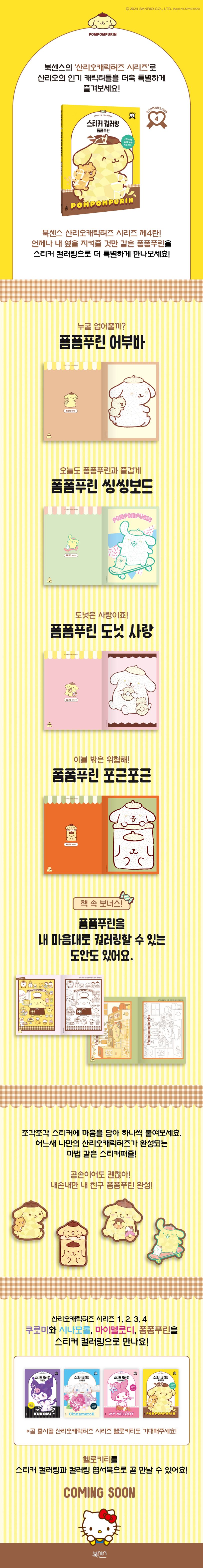 소장가치 100%의 스티커 컬러링북, 산리오캐릭터즈 시리즈 1, 2, 3에 이어 나의 곁을 든든하게 지켜줄 것만 같은 따뜻한 친구 《스티커 컬러링: 폼폼푸린》이 출시되었다. 《스티커 컬러링: 폼폼푸린》에서는 언제나 밝고 유쾌한 미소를 가진 폼폼푸린의 다양한 모습을 만날 수 있다. 언제나 따뜻한 품과 등까지 내어주는 폼폼푸린과 즐겁고 유쾌한 놀이를 즐기는 폼폼푸린, 도넛을 사랑하는 폼폼푸린, 포근한 이불 속에서 더 포근하게 우리를 반겨줄 폼폼푸린 등이다.