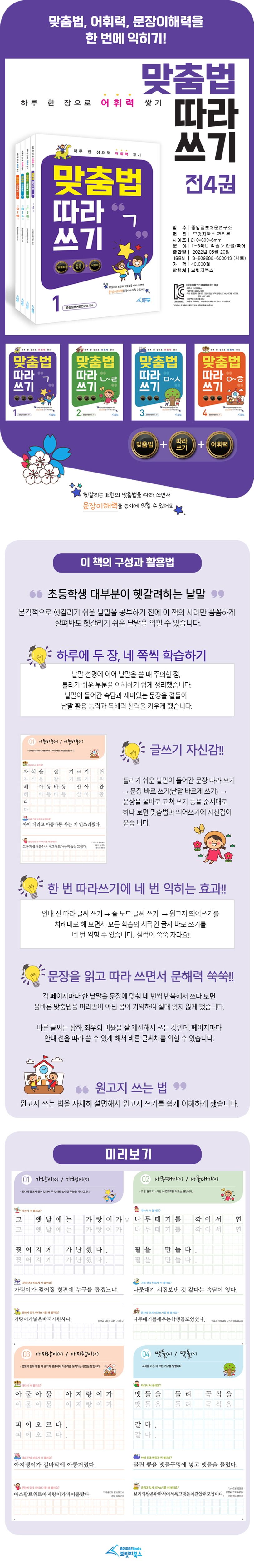 ㆍ 틀리기 쉬운 낱말이 들어간 문장 따라 쓰기 → 잘못 쓴 낱말 고쳐서 문장 바로 쓰기 → 띄어쓰기가 생략된 문장을 올바로 고쳐 쓰기 등을 순서대로 하다 보면 맞춤법과 띄어쓰기에 자신감이 붙습니다.