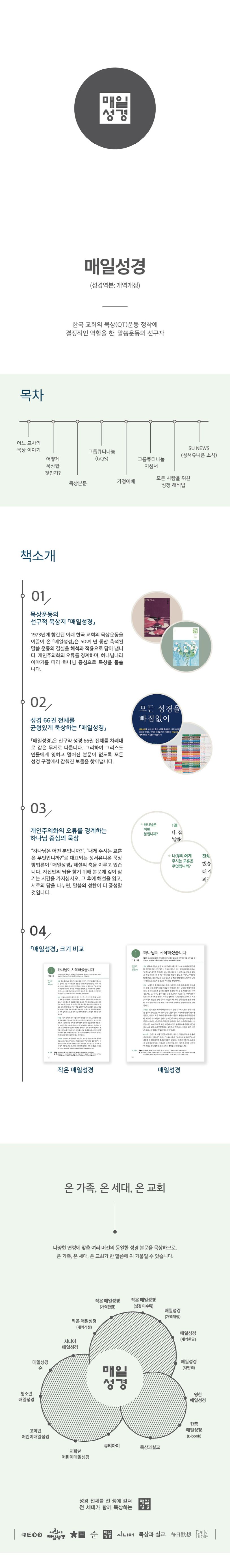 매일성경은 성서유니온선교회(SCRIPTURE UNION)가 한국교회와 성도들을 위해 1973년부터 꾸준히 발행해 온 큐티 노트입니다. 매일성경의 소명은 그리스도인들이 매일 성경을 통해 하나님을 만나도록 돕는 일입니다. 이 목표를 위해 독자가 최대한 성경 분문에 집중할 수 있도록 곁가지들은 과감히 생략하고 대신 성경 본문의 이해를 돕는 해설과 적용을 풍성하고 충실하게 제공합니다.