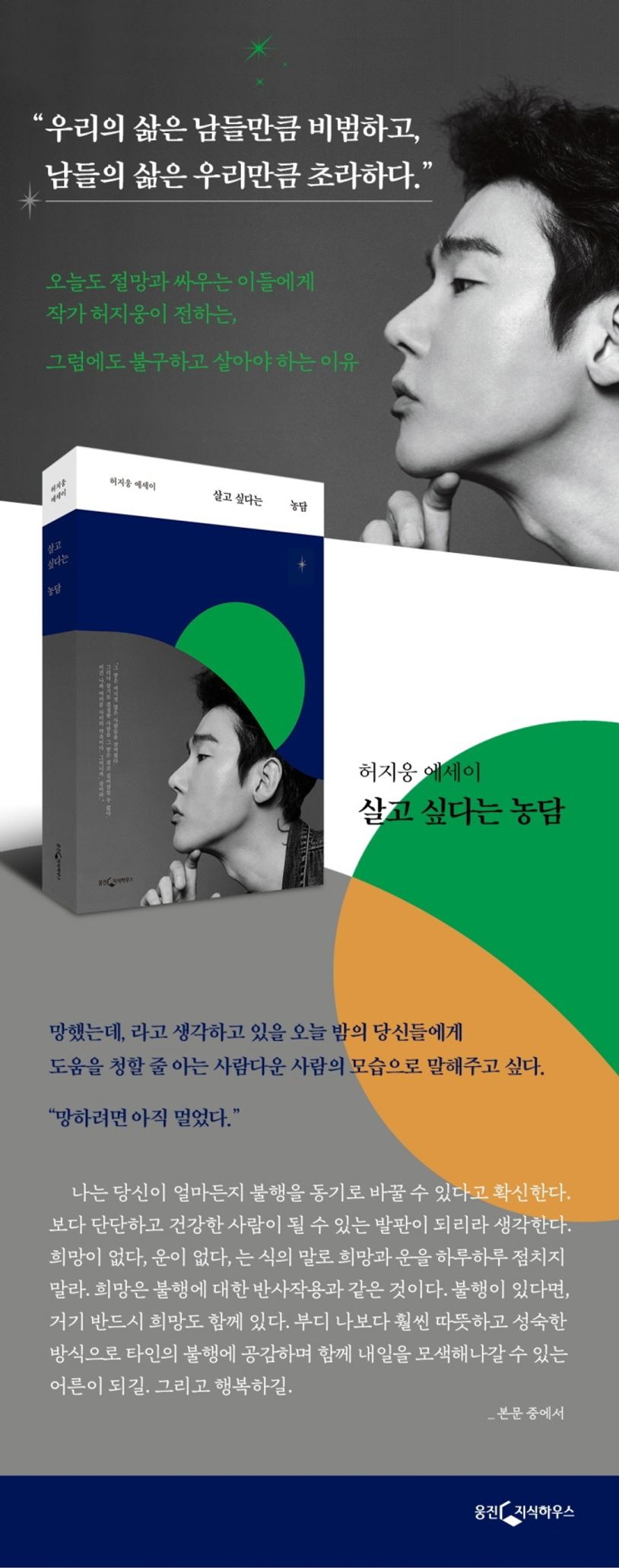 『살고 싶다는 농담』은 작가 허지웅이 2018년 혈액암의 일종인 악성림프종이라는 큰 시련을 겪은 뒤, 인생에 대해 이전과는 확연히 달라진 시각을 가지고 혼신의 힘을 기울여 쓴 신작 에세이다. 저마다 자신만의 무거운 천장을 어깨에 이고 무너지지 않으려 애쓰는 사람들, 기대어 쉴 곳 없이 지쳐 있는 사람들에게 들려주고 싶은 25편의 이야기들을 담았다. 전작 『나의 친애하는 적』 이후 4년 만에 발표하는 이번 신작에서 작가 허지웅의 삶의 해석은 더 예리해지고, 사람을 향한 애정은 더 깊어졌다.
