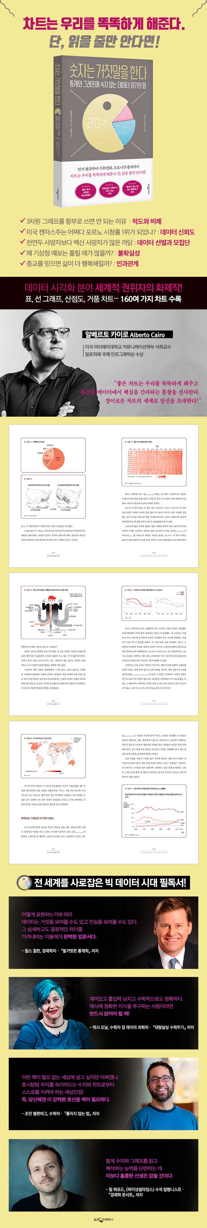 『숫자는 거짓말을 한다』는 객관성과 신뢰도의 상징과 같은 차트가 어떻게 데이터를 왜곡해 우리를 오해와 착각의 늪으로 이끄는지 밝혀낸다. 데이터 시각화 분야의 세계적 권위자인 저자는 차트에 속지 않고 잘 써먹기 위해서는 차트를 읽고 해석하는 능력을 길러야 한다고 말한다. 이 책은 차트의 기본 개념을 차근차근 설명하며 잘못된 차트를 가려내는 5가지 기준을 제시한다. 통계나 그래프에 관한 여느 도서와 달리 이 책은 이론을 나열하지 않는다. 그 대신 선거 판세, 경제 전망, 출산율, 범죄율, 코로나19 현황처럼 우리의 삶과 밀접한 사례들을 가득 담아 차트에 관한 배경지식이 부족한 독자들도 읽기에 부담이 없다. 기업의 실적 보고나 광고에서 쓰이는 3차원 시각 효과가 위험한 이유, 캔자스주가 미국에서 가장 높은 포르노 시청률을 기록한 사연, 태풍 예보도 속 원뿔에 관한 오해 등 흥미와 놀라움을 자아내는 이야기들도 가득하다. 뉴스나 기사, 소셜 미디어에서 흔히 접하는 표와 지도, 막대그래프, 산점도, 거품 차트 등 160여 개의 차트가 수록되어 있어, 데이터에 숨겨진 욕망과 의도, 패턴을 정확히 읽어내는 안목을 기르기에도 안성맞춤이다.