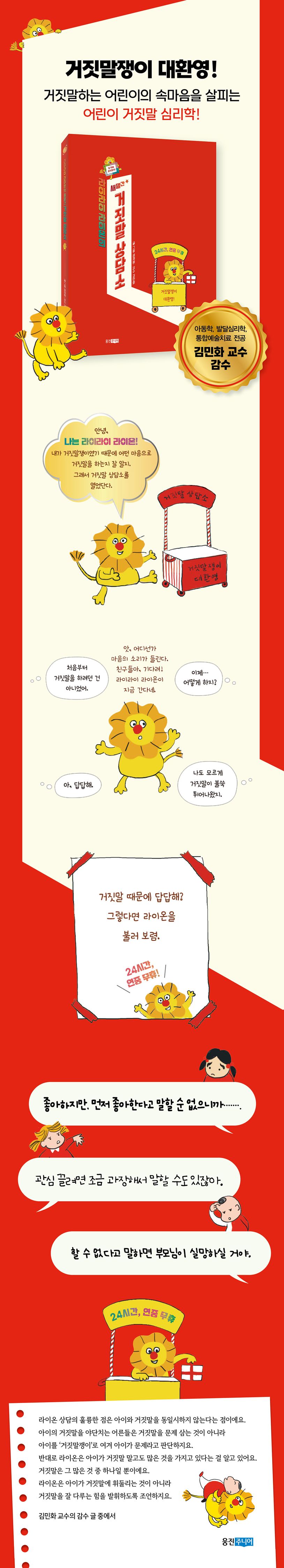 거짓말은 정말 해서는 안 되는 걸까? 거짓말하는 사람은 다 문제인 걸까? 어쩌다 튀어나온 거짓말이 또 다른 거짓말을 낳는다면? 말을 안 하는 것도 거짓말인가? 거짓말을 두고 꼬리에 꼬리를 물고 이어지는 물음에 답하기 위해 라이라이 라이온이 나섰다! 입만 열면 거짓말을 일삼는 거짓말쟁이였기 때문에, 거짓말하는 아이들의 속마음을 가장 잘 안다고 자부하는 라이온. 『라이라이 라이온의 새빨간 거짓말 상담소』는 진심 어린 공감과 유머, 재치 넘치는 상상력으로, 거짓말의 굴레 속에서 스스로를 옥죄고 있던 이들에게 통쾌한 돌파구를 선사할 것이다. 24시간, 연중 무휴! 라이온의 거짓말 상담소의 문은 언제나 활짝 열려 있다!