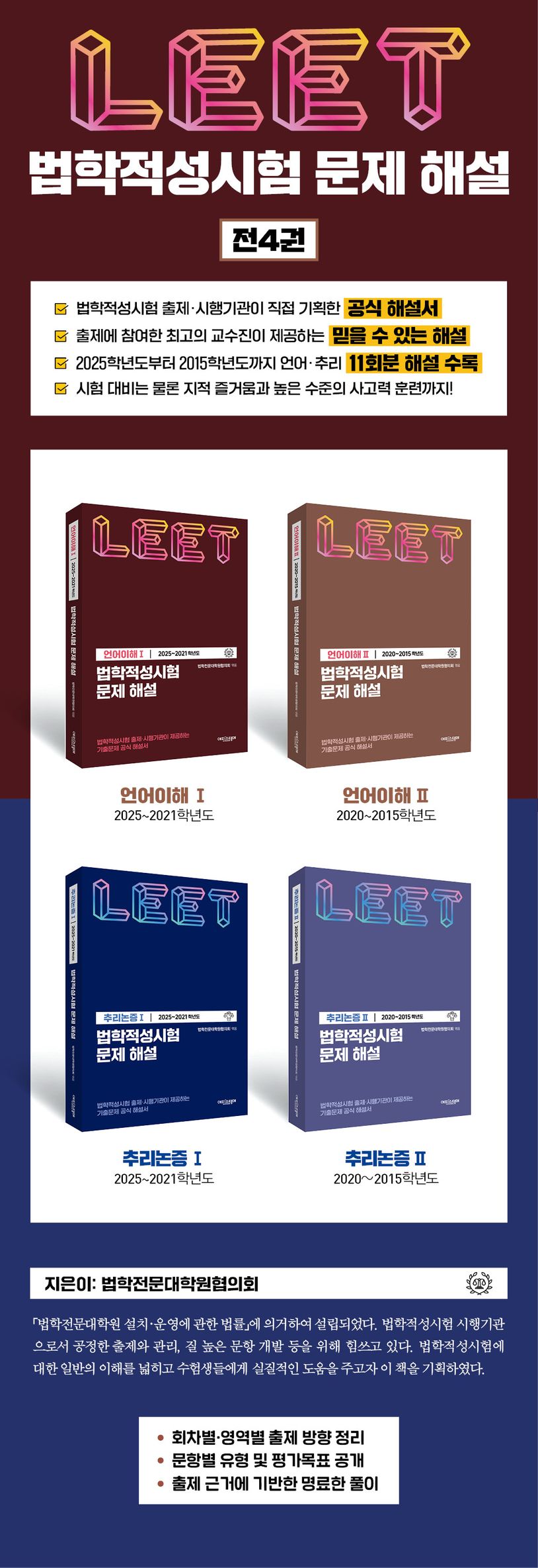 법학적성시험(LEET) 추리논증 영역 최신 5회분(2025~2021학년도)의 기출문제와 해설을 담은 책으로, 출제에 참여한 다양한 분야 최고의 교수진이 제공하는 공신력 있는 해설을 만나 볼 수 있다. 법학적성시험에 대한 일반의 이해를 넓히고 수험생들에게 실질적인 도움을 주고자 법학전문대학원협의회가 직접 기획하였다.