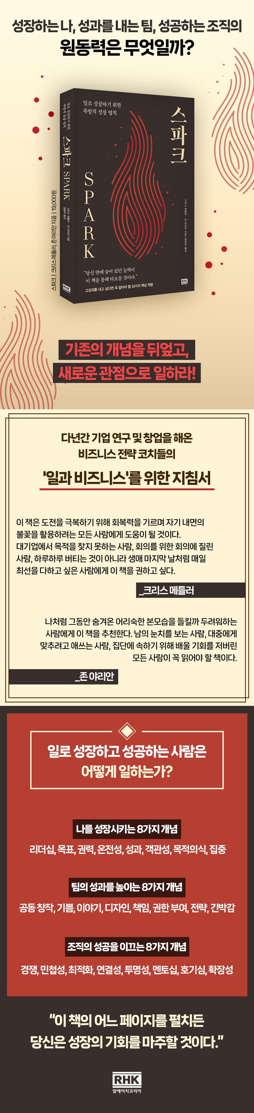 이 책에서는 개인, 팀, 조직이 성장하는 원동력이 되어주는 24개의 가치 있는 개념을 소개한다. 리더십과 권력, 성과와 같은 개인이 갖춰야 할 개념은 물론이고 목적의식, 책임, 전략 등의 여럿이 함께 일할 때 필요한 개념, 그리고 경쟁, 멘토십, 최적화 등 조직이 성공하는 데 필수적인 개념을 설명하고 있다. 각 장에서 설명하는 개념들은 기존에 우리가 알고 있던 개념과 달리 새로운 의미를 부여받아, 읽는 사람에게 영감의 불꽃 즉, 스파크가 되어준다. 또한 각 장은 사전처럼, 플레이 리스트처럼 구성되어 있어 순서대로 읽지 않고 필요한 부분만 읽어도 된다. 어느 부분을 펼치든 당신은 성장의 기회를 마주할 테다.